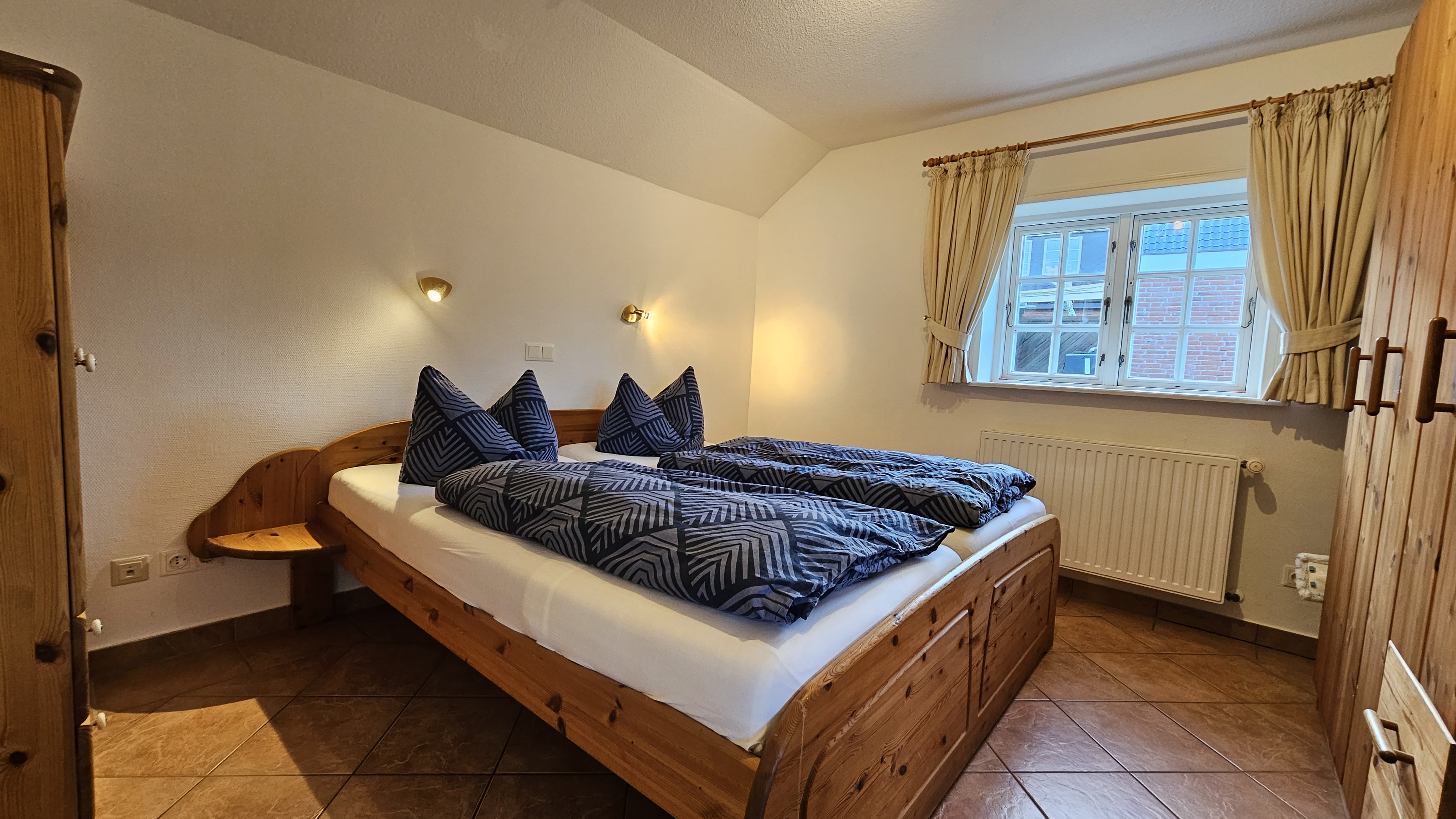 Das sehr geräumige Bad besteht aus einem stufenlosen, ebenerdigen Duschbad, einer Toilette und einem Waschbecken mit einem großen Spiegel. Die Belüftung erfolgt über ein Außenfenster. Der Schlafraum ist eingerichtet mit einem Doppelbett, einem großen Kleiderschrank mit eingebautem Möbelsafe und einem kleineren Schrank.