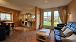 Der Wohnbereich ist ausgestattet mit einem Sofa, sowie einem Tisch und 2 Sessel. Zur Unterhaltung stehen in der Wohnung ein Fernsehgerät mit Sat-Anschluß, ein DVD-Player sowie ein Radio/CD-Player bereit. Der Wohnbereich geht nahtlos in einen offenen Küchenbereich über, bestehend aus einer Küchenzeile, ausgestattet mit einem Ceran-Platten Herd, Backofen, Geschirrspüler, Mikrowelle und Kühlschrank, den üblichen Kleingeräten wie Kaffeemaschine, Wasser- und Eierkocher, sowie einem Esstisch mit Stühlen.